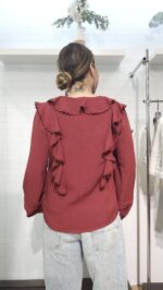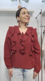 Añade un toque de sofisticación y movimiento a tu armario con nuestra blusa de inspiración romántica. Destaca por su vibrante color teja y un diseño de volantes frontales que aportan textura y un aire femenino irresistible.
