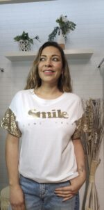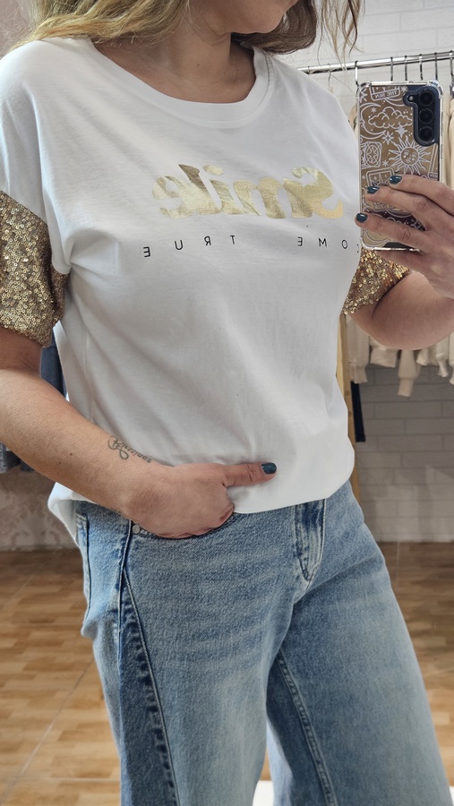 Haz brillar tu día con esta prenda única , nuestra blusa Golden Smile combina la frescura de una camiseta blanca clásica con el toque glamuroso de mangas bordadas en lentejuelas doradas.