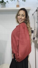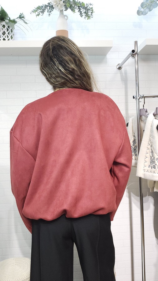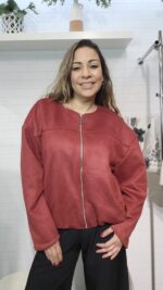 Chaqueta diseño minimalista en color granate con acabado aterciopelado, su corte relajado de hombros caídos y el cierre frontal con cremallera metálica la convierten en una prenda versátil y moderna. Es ligera, cómoda y perfecta para elevar cualquier conjunto diario con un toque de sofisticación.