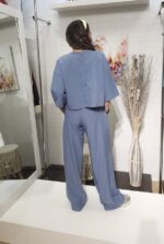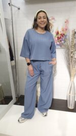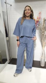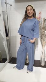 Conjunto de blusa manga media y pantalón wide leg. Un diseño fluido, cómodo y con un toque de brillo sutil que marca la diferencia. Tu nuevo favorito para un look total en tendencia.
