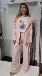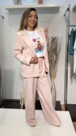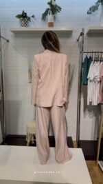 Eleva tu estilo con nuestro Conjunto Gala Blush, un dos piezas diseñado para la mujer que busca sofisticación y comodidad en un solo look. Este traje en un delicado tono rosa pastel combina una blazer fluida de corte impecable con unos pantalones de pata ancha que estilizan la figura y aportan movimiento.