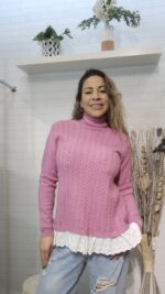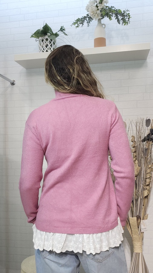 El equilibrio perfecto  entre comodidad y delicadeza. Nuestro jersey Alba destaca por su suave tejido de ochos en color rosa y ese romántico bajo de encaje bordado que le da un toque diferente a cualquier look diario.