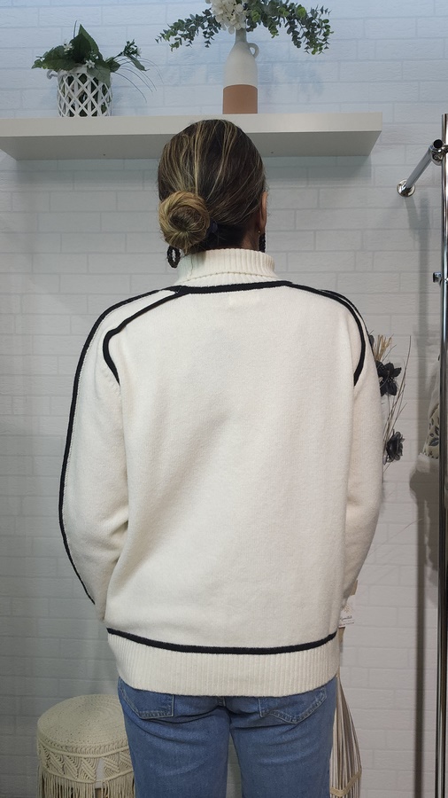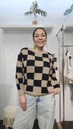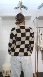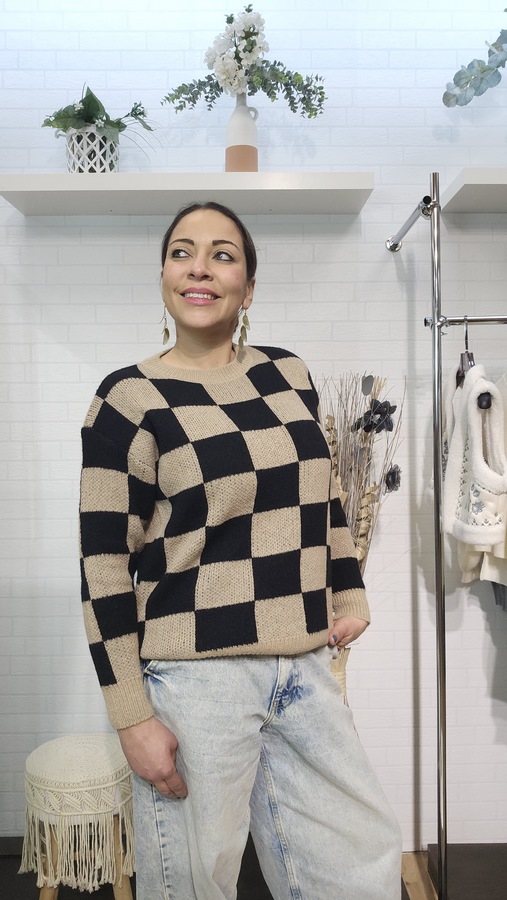Un diseño gráfico impactante que define cualquier conjunto. Este Jersey combina la sencillez del beige y negro con la fuerza visual del estampado damero.  Perfecto para dar protagonismo a tus looks básicos, aportando estructura y un toque vanguardista sin esfuerzo.