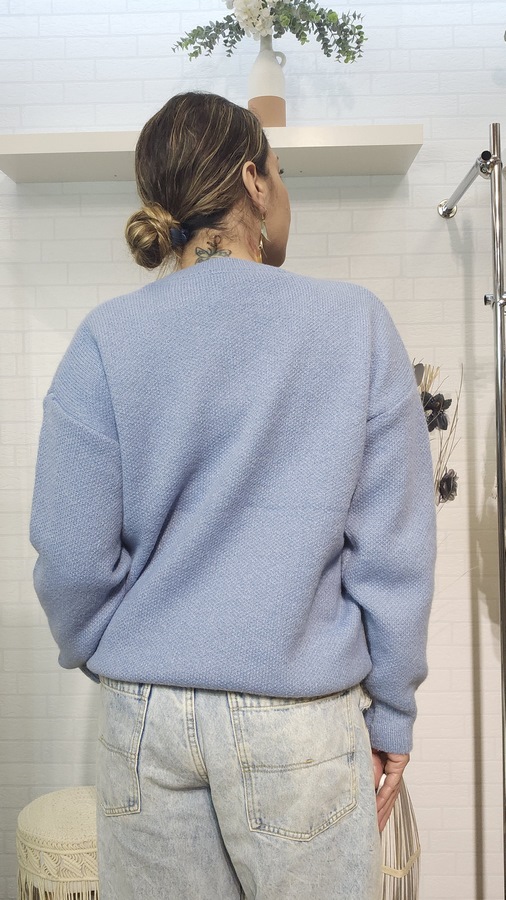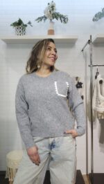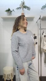 Añade un toque de dulzura y sofisticación a tu estilo diario con este jersey en color gris melange. Destaca por sus exclusivos botones dorados tipo joya en los hombros y un práctico bolsillo frontal adornado con un delicado ribete festoneado en contraste blanco.