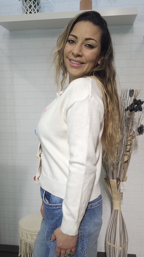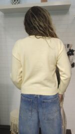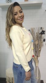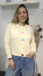 Dale un toque de ternura a tu look diario con este cárdigan de punto en tono amarillo mantequilla. Su diseño clásico se renueva con unos botones tridimensionales en forma de corazón en colores pastel, que lo convierten en la pieza protagonista de cualquier outfit.
