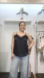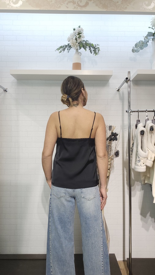 Eleva tus básicos con este cautivador top lencero en color Negro. Su acabado satinado aporta un brillo lujoso, mientras que el delicado encaje negro en el escote añade un toque de sensualidad y elegancia atemporal.