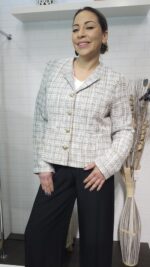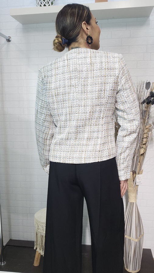 Chaqueta de Tweed de corte recto y diseño estructurado en una luminosa mezcla de tonos crudos y metalizados. Destaca por su sofisticada botonadura dorada grabada y bolsillos de ojal frontales. Una pieza clave que aporta un aire de distinción francés tanto a tus looks de diario con vaqueros como conjuntos formales.