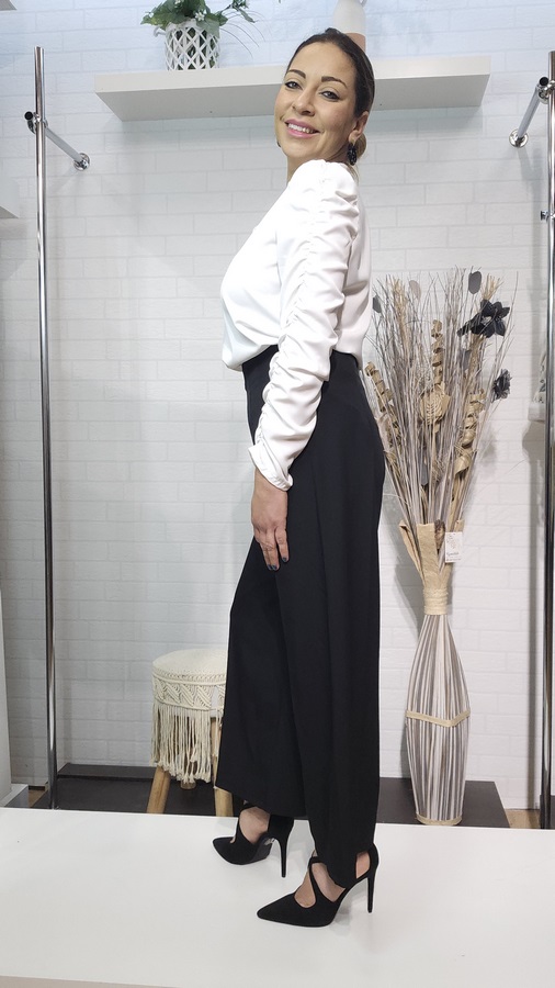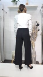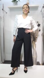 La máxima expresión de sofisticación y confort. Este pantalón de corte palazzo en color negro destaca por su tiro ultra alto que estiliza la silueta y su caída fluida de gran movimiento. Presenta un diseño de pierna ancha con nervadura central marcada, ideal para crear un look impecable de oficina o un conjunto de noche lleno de distinción.