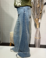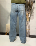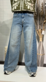 Un giro moderno al denim clásico. Estos vaqueros de pata ancha destacan por su innovador diseño en dos tonos de azul, creando un contraste vertical que estiliza y alarga la silueta. Con un acabado de bajo deshilachado y un corte holgado de tendencia, son la prenda perfecta para quienes  buscan un estilo urbano, atrevido y lleno de personalidad.