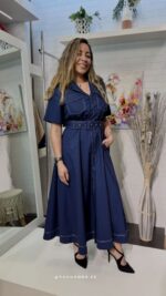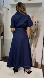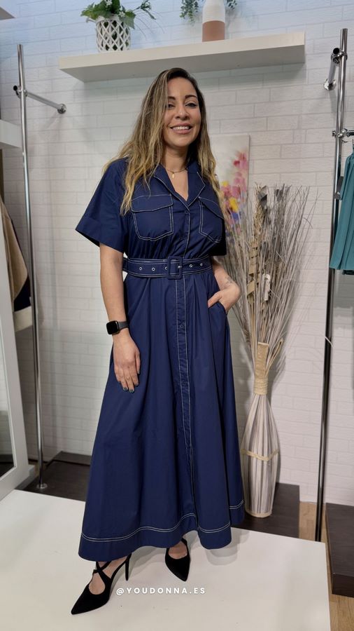 Nuestra nueva joya, presentamos el vestido naval chic, un diseño camisero largo en el azul marino más elegante. El toque mágico lo dan las costuras blancas a contraste, que perfilan el cuello solapa, los botones, los bolsillos militares en el pecho y el bajo de la falda con vuelo.